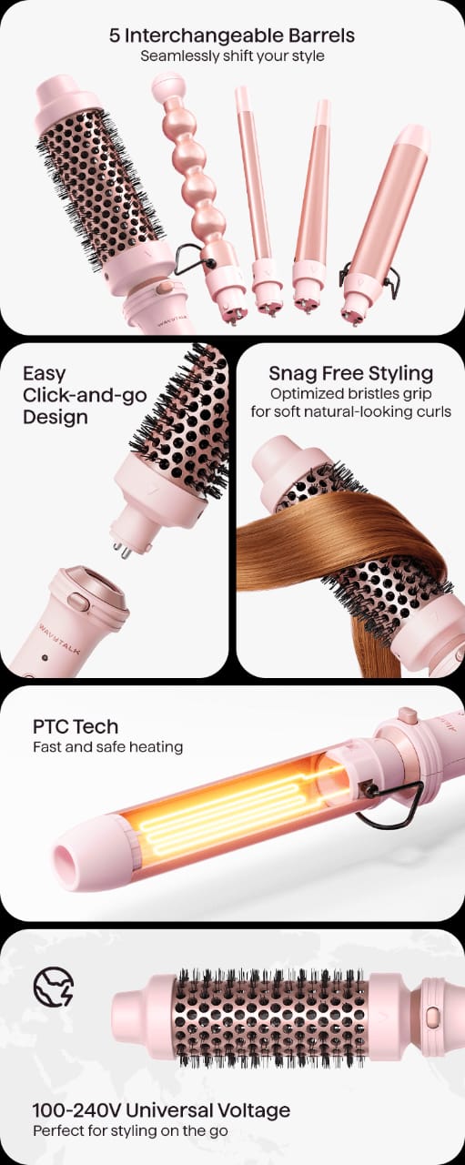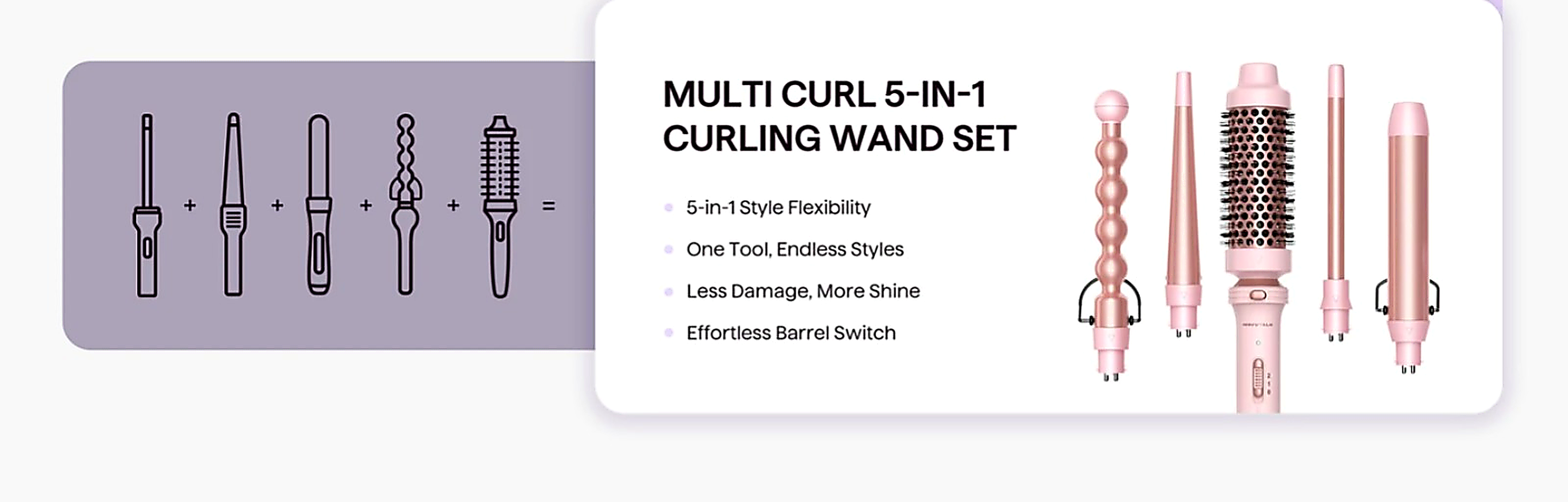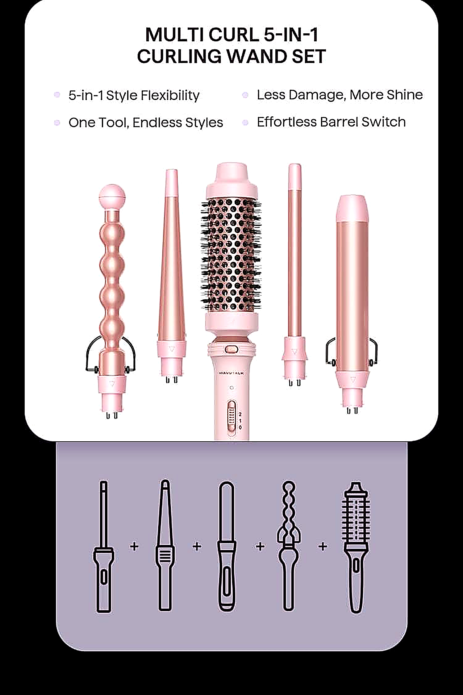 Utilize the Fiora 5-IN-1 Curling Wand Set to Create Soft Curls, Glamorous Waves, and Loose Waves with Ease!